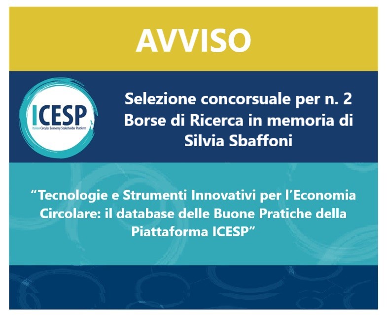 Avviso di selezione concorsuale per n. 2 Borse di Ricerca sul tema “Tecnologie e Strumenti Innovativi per l’Economia Circolare: il database delle Buone Pratiche della Piattaforma ICESP”: Borse di ricerca in memoria di Silvia Sbaffoni (RIF. SSPT-BR/01/2025)